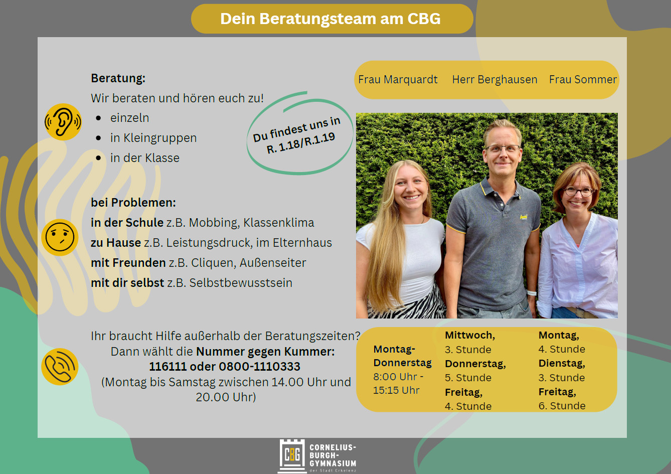 Das Beratungsteam versteht sich als Teil eines tragfähigen beratenden Netzwerkes am CBG. Es besteht aus drei fachlich geschulten Lehrpersonen des Kollegiums, aktuell sind dies Hr. Berghausen und Fr. Sommer. Ergänzt wird das Team durch die Schulsozialarbeiterin Frau Marquardt, deren Vorteil darin liegt, dass sie keine Lehrperson ist und die Lernenden somit aus neutraler Perspektive begleiten kann.