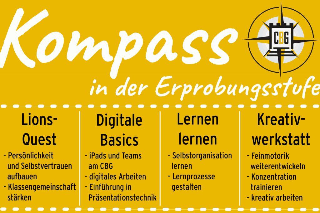In der Erprobungsstufe findet für alle Schüler*innen eine Kompass-Stunde pro Woche statt. Diese ist in vier Module unterteilt, die nacheinander in einem Schuljahr durchlaufen werden.